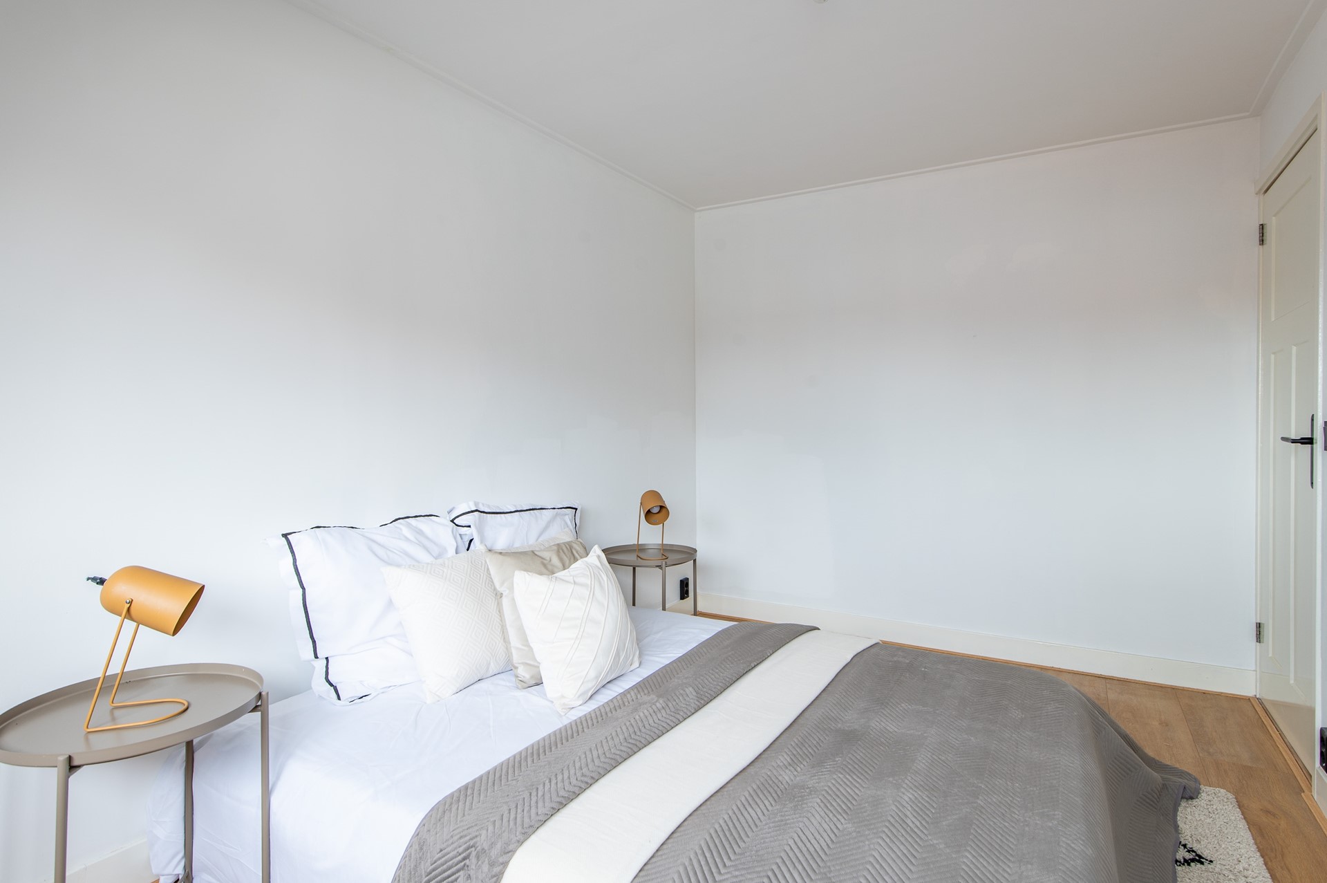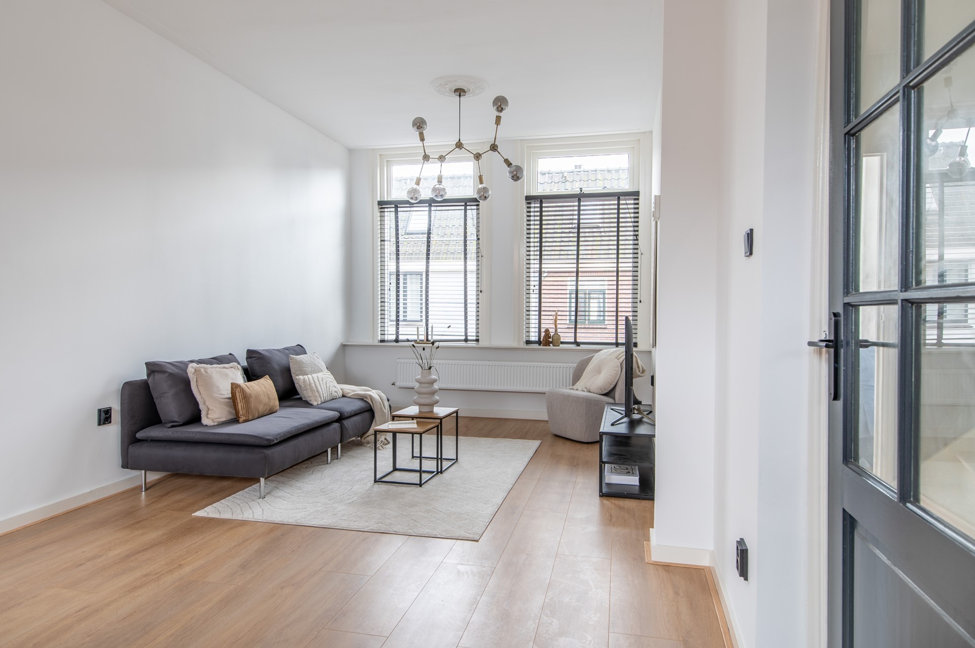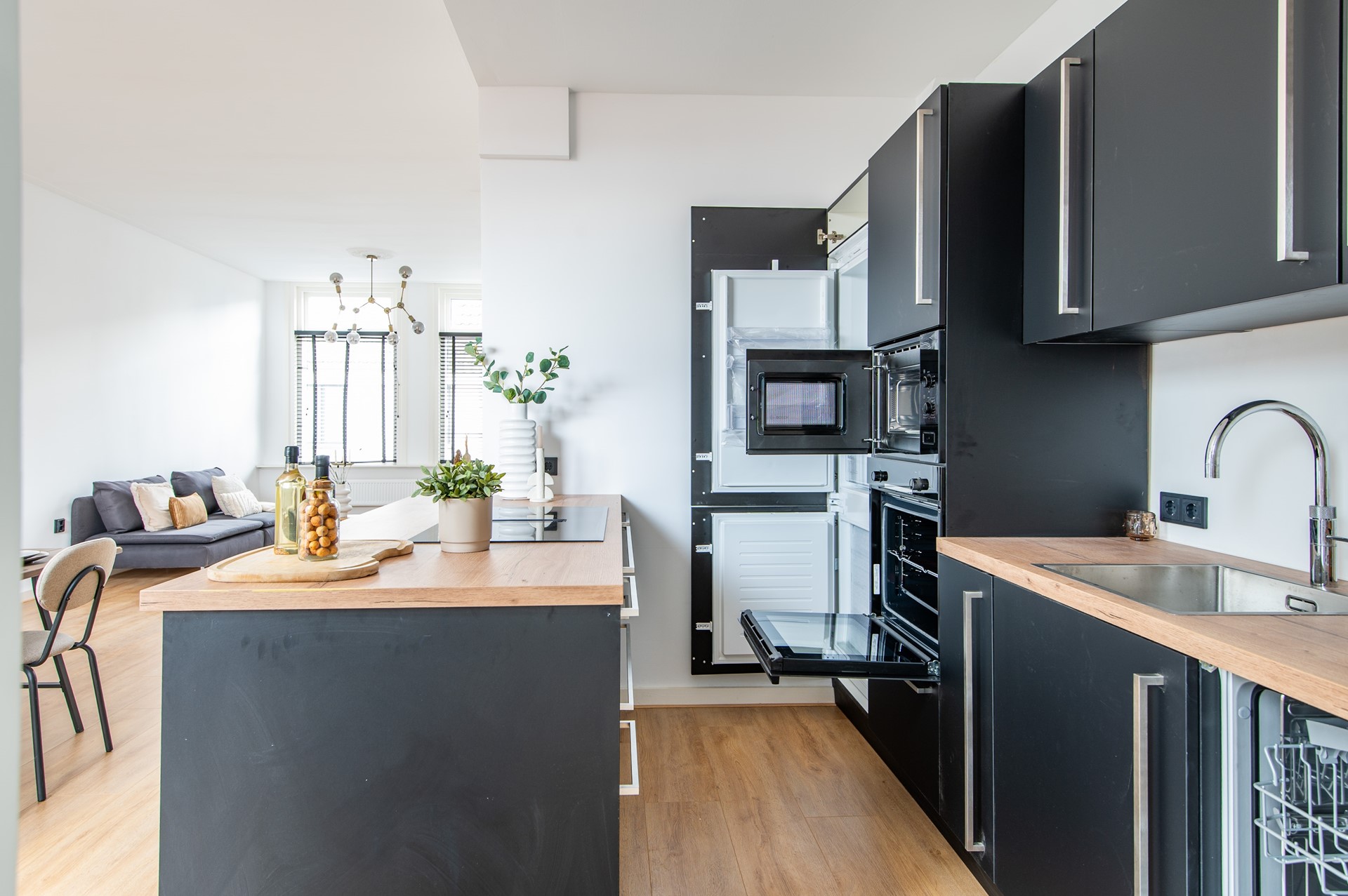 Op de overloop bevindt zich de garderobe, vrijdragend toilet en toegang tot de slaap-/werkkamer en de woonkamer aan de voorzijde. Nu kun je in de woonkamer met hoog plafond aan de voorzijde genieten van het gezellige straatbeeld en is aan de andere kant van de kamer de eettafel geplaatst direct bij de nieuwe open keuken. De keuken is nieuw en heeft een rechte opstelling met daarvoor een schiereiland. Het geheel is voorzien van inbouwapparatuur waaronder een inductiekookplaat met ingebouwde afzuigunit, vaatwasser, magnetron, heteluchtoven, koel-/vrieskast en een Quooker. Alleen nog boodschappen doen en de thuiskok kan hier de lekkerste maaltijden bereiden. Naast de keuken is de bijkeuken met opstelplaats voor de wasmachine. Aan de achterzijde is het balkon dat met dubbele openslaande deuren bereikbaar is en op een zonnige dag een verlening van je leefruimte.