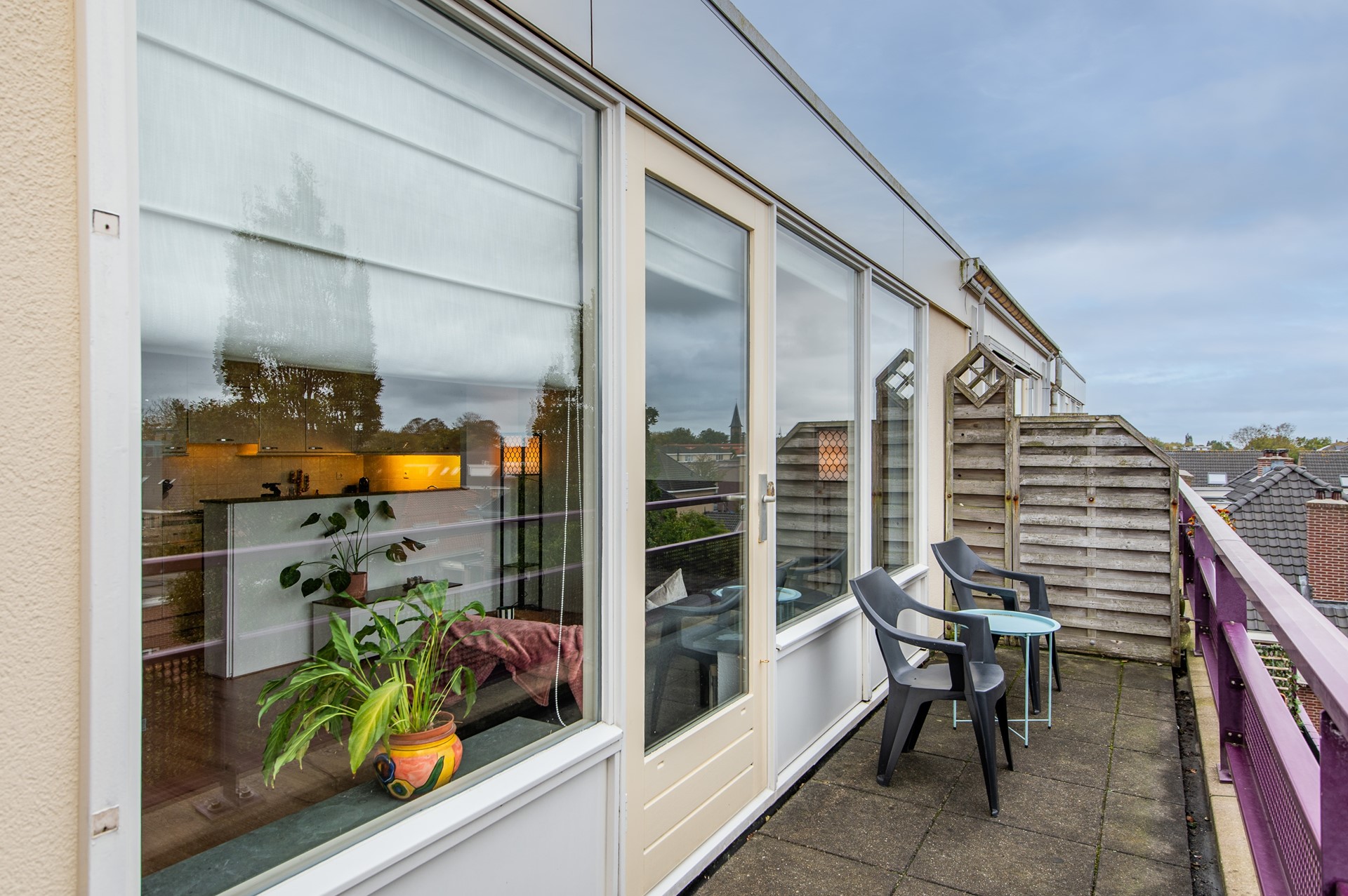 Het appartement is gelegen op de 3e etage en bereikbaar via de galerij. Je komt de woning binnen via de hal met garderobe en meterkast. De hal verbindt alle ruimtes met elkaar en aan het einde van de hal is de deur naar de ruime living. Er is een goede zithoek met veel daglicht doordat er ramen zijn geplaatst over gehele breedte van de kamer en in het midden een deur naar het balkon. Het zonnige balkon op het westen strekt zich uit over de gehele breedte van de woning en is daarmee een fijne plek om buiten te zitten. Je hebt hier een leuke doorkijk over het centrum richting de kerk.