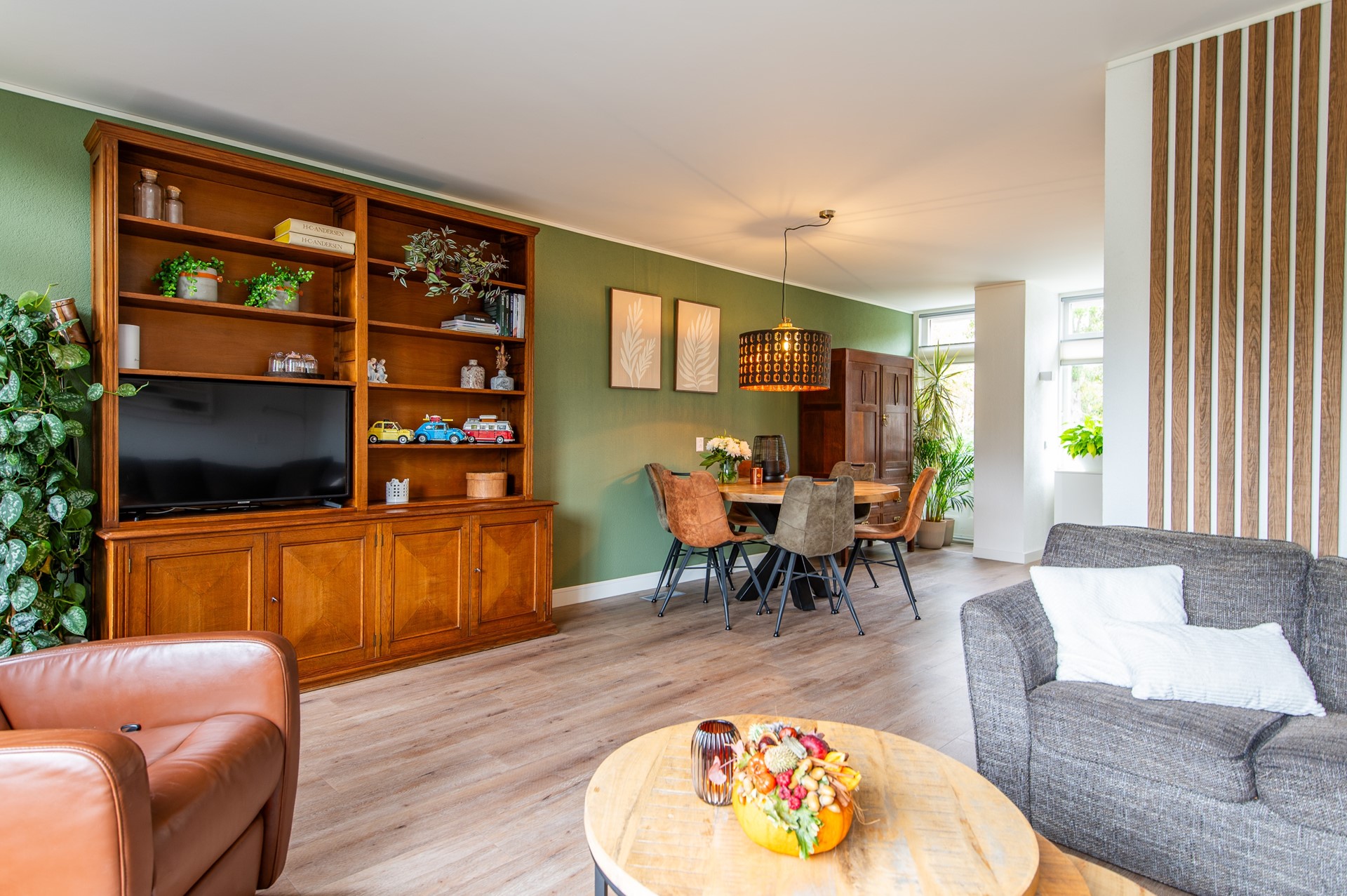 De woning heeft een entree via de voortuin, waar ook de berging is voor de fietsen. Je komt binnen in de hal met grote inbouwkast, waar de garderobe en ook andere zaken netjes opgeborgen kunnen worden. Tussen de hal en keuken is er een strakke deur met glas geplaatst en zo kom je in de moderne greeploze keuken. De moderne keuken is geplaatst in een hoekopstelling en voorzien van de volgende inbouwapparatuur: inductiekookplaat, afzuigkap, combimagnetron, vaatwasser en een losse koel-/vrieskast. Door de hoek optimaal te gebruiken is er een goed werkblad en veel kastruimte. Een grote eettafel is centraal geplaatst tussen de keuken en de woonkamer. Prettig is dat enkele jaren geleden toen de keuken is vervangen ook meteen de meterkast is aangepakt. Er is een tussenhal met de trap naar boven en een modern vrijdragend toilet met fontein. De lichte woonkamer met mooie PVC vloer is tuingericht en daardoor een prettige ruimte, welke eenvoudig kan worden uitgebouwd. Door de warme natuurlijke tinten wordt de ruimte extra