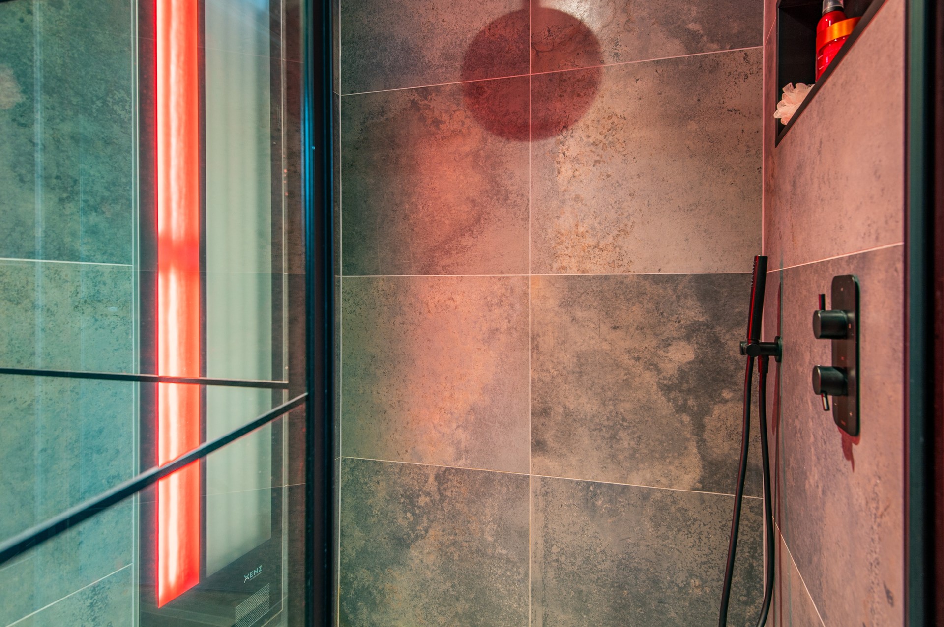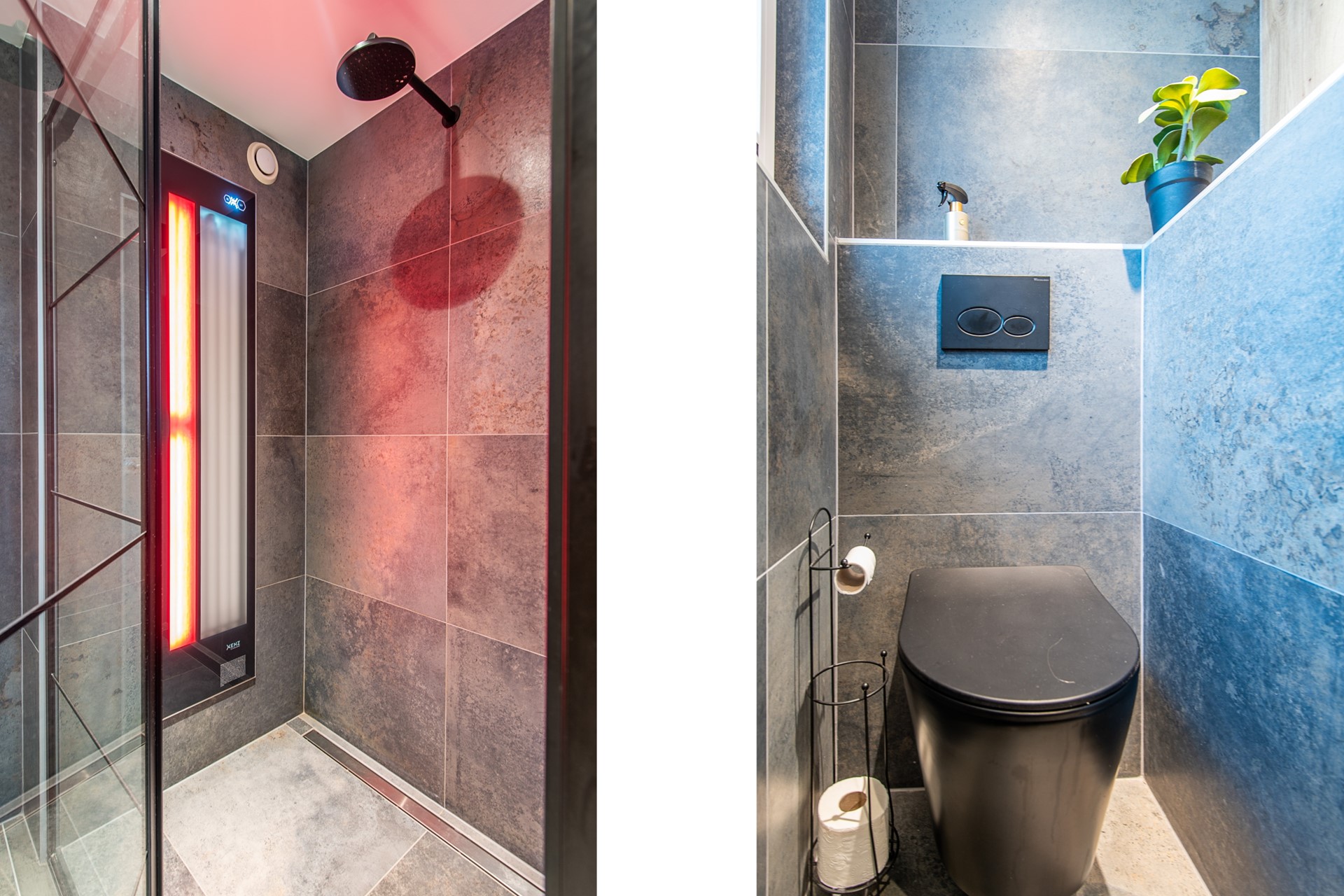 Op de 1e etage bevinden zich 2 slaapkamers en de moderne badkamer. Aan de voorzijde is de ruime badkamer met grote inloopdouche voorzien van vloerverwarming, rainshower met sunshower en brede deur, een deels afgeschermd toilet, wastafelmeubel met waskom en 2 hangkasten tegenover de douche. Het geheel is hoogwaardig afgewerkt met zwart/grijstinten en houten accenten.