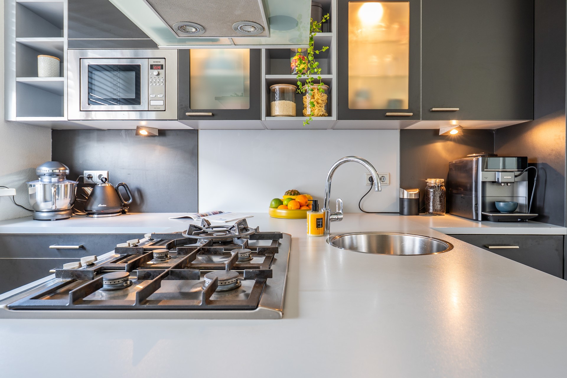 Je komt de woning binnen de in de hal met garderobe, meterkast, toilet, trap naar boven en deur naar de kamer. Aan de voorzijde van de begane grond is de keuken geplaatst in een recht deel met schiereiland. Het schiereiland bevat het kookgedeelte met gaskookplaat met wokbrander, daarboven afzuigschouw en daaronder de heteluchtoven. Verder is de keuken voorzien van een magnetron, koelkast met vriesvak, vaatwasser en veel bergruimte. Door de opstelling met het schiereiland een leuke plek in huis om echt samen te koken.