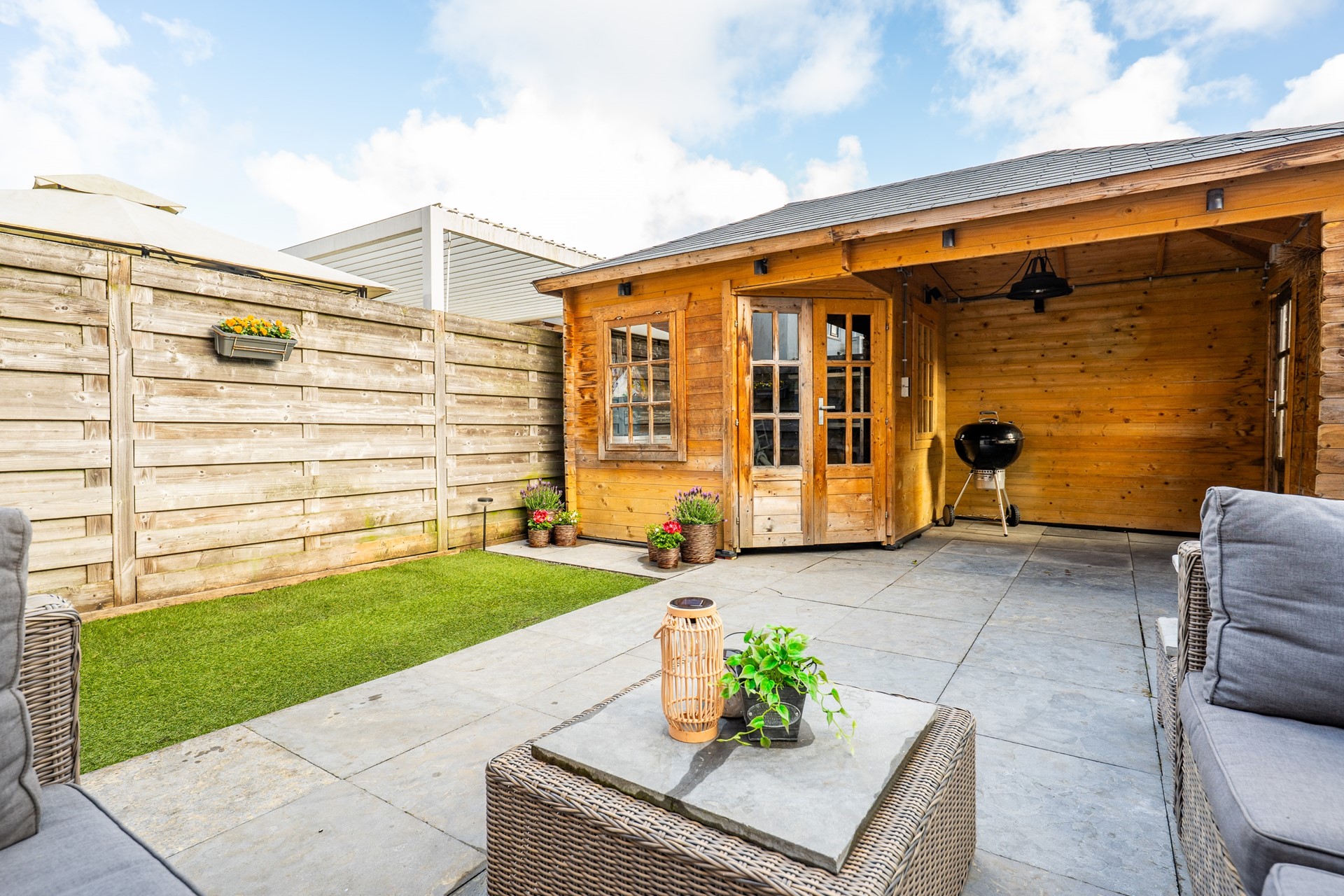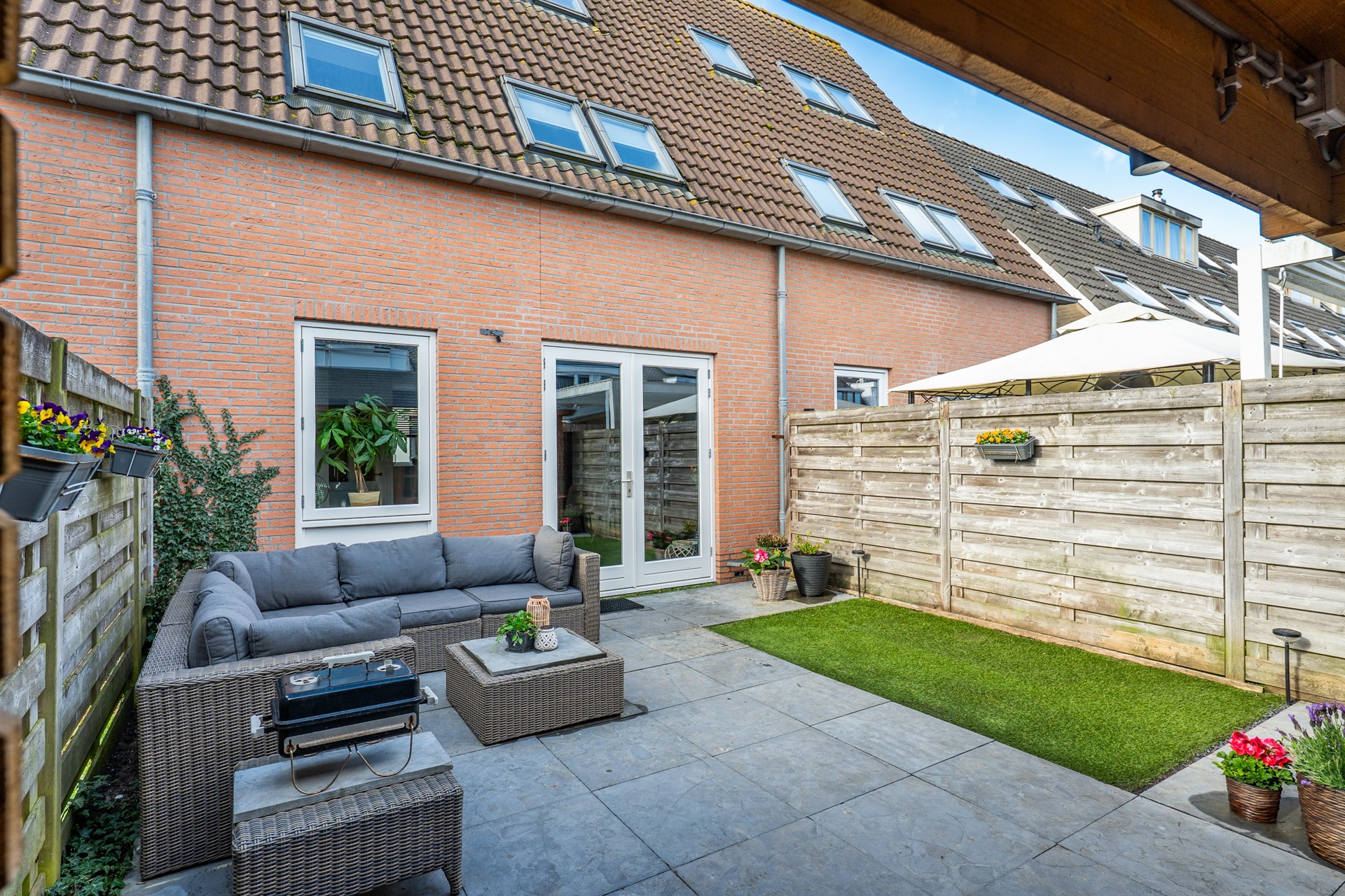 De tuin is een fijne plek om samen te genieten na een drukke dag of in het weekend als de barbecue aangaat waarbij je onder de overkapping naast de berging tijdens een lente bui toch droogt blijft.