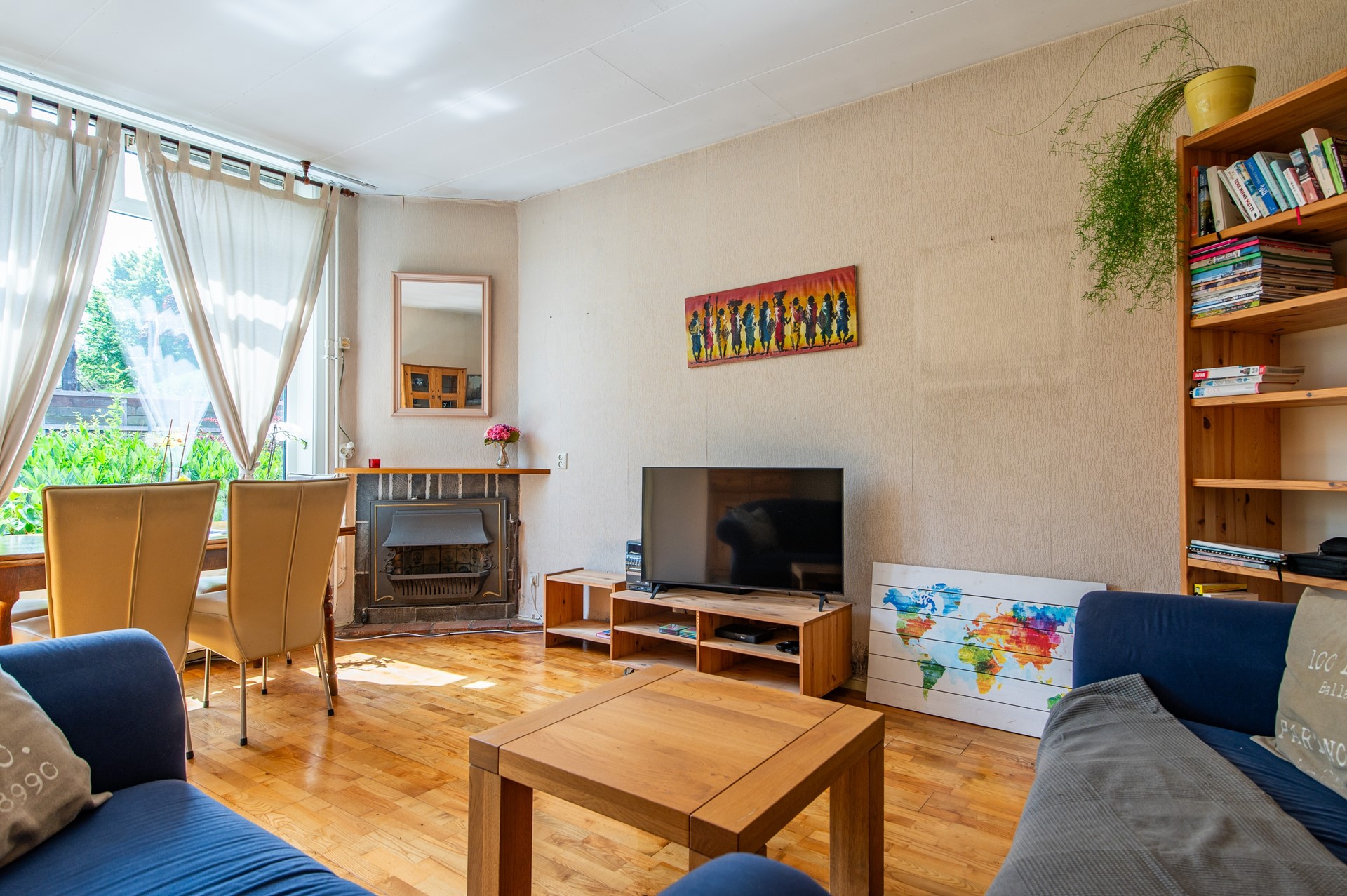 De woonkamer heeft een grote raampartij met zicht op de straat en toegang tot de semi-open keuken. Vanuit de keuken is de zonnige achtertuin bereikbaar die een verbinding heeft met de tuin van nummer 157. De woonkamer is een goede ruimte met daarnaast een kamer die nu als werkkamer wordt gebruikt. Tegenover de werkkamer is de slaapkamer en naast de werkkamer is de badkamer. De woning is gelijkvloers, maar naar de slaapkamer zit er een kleine afstap.